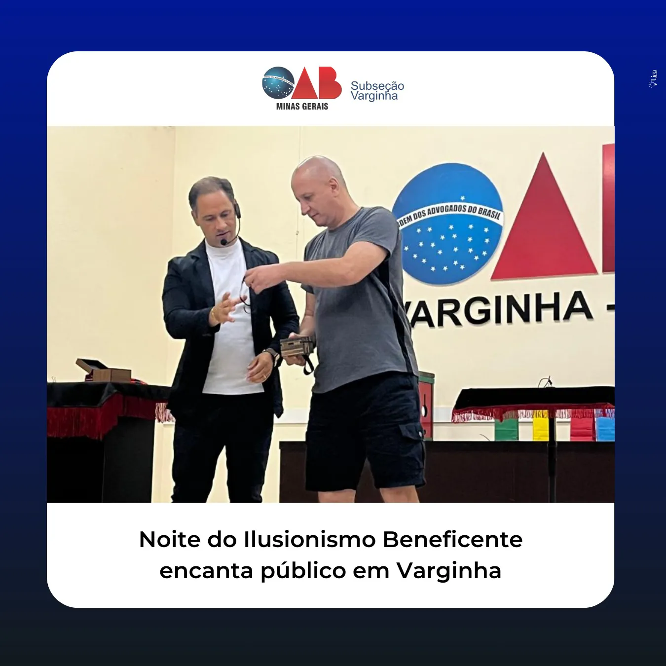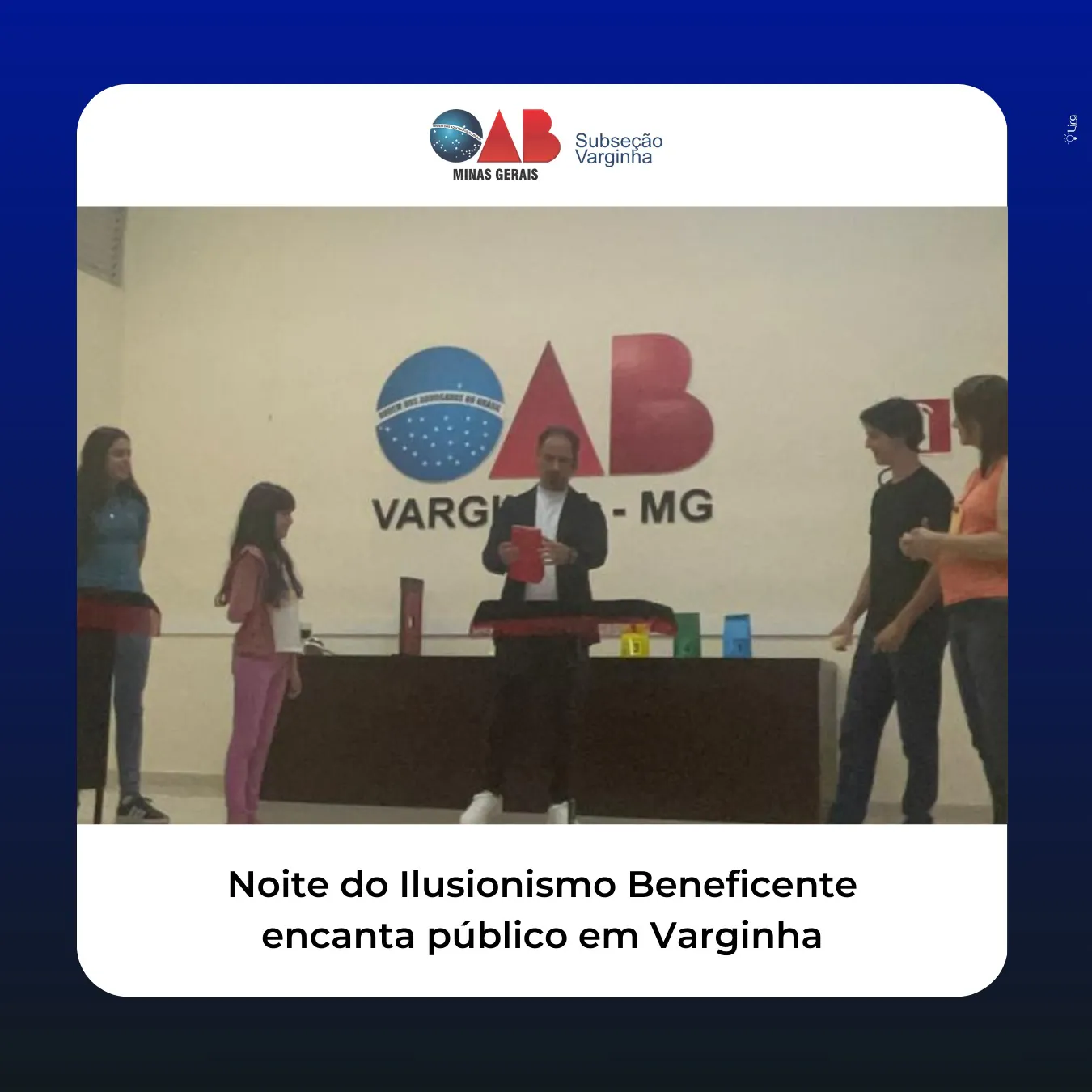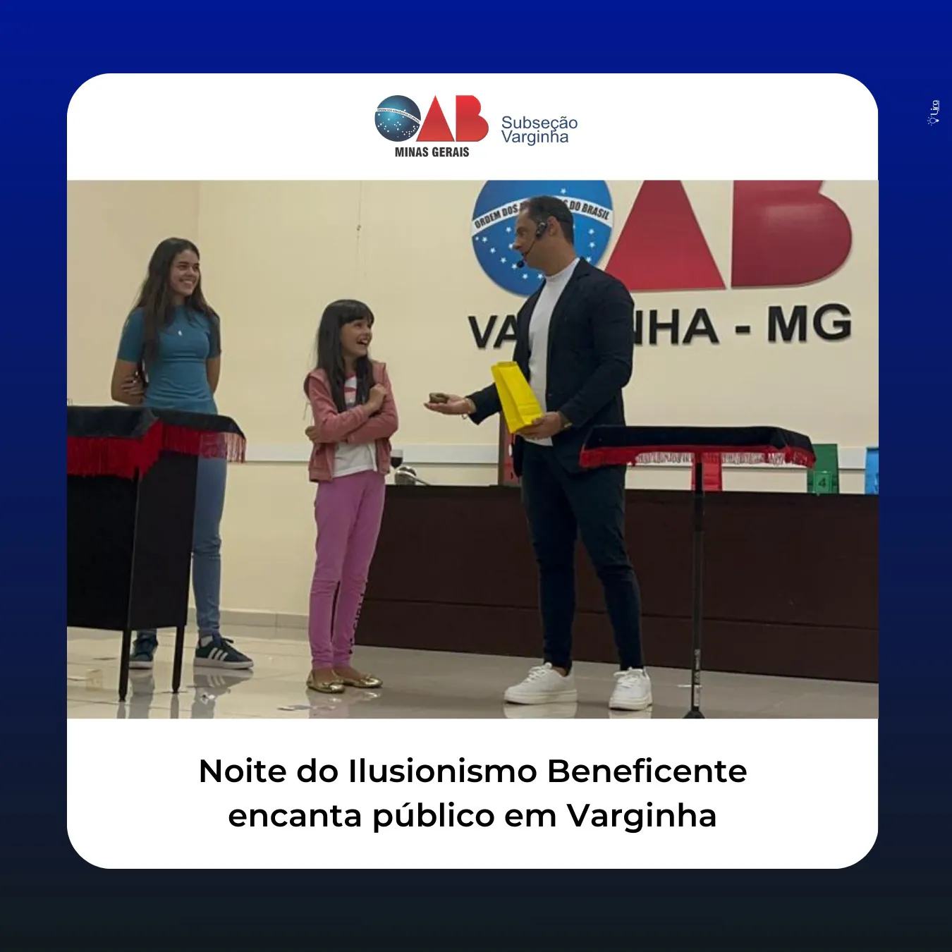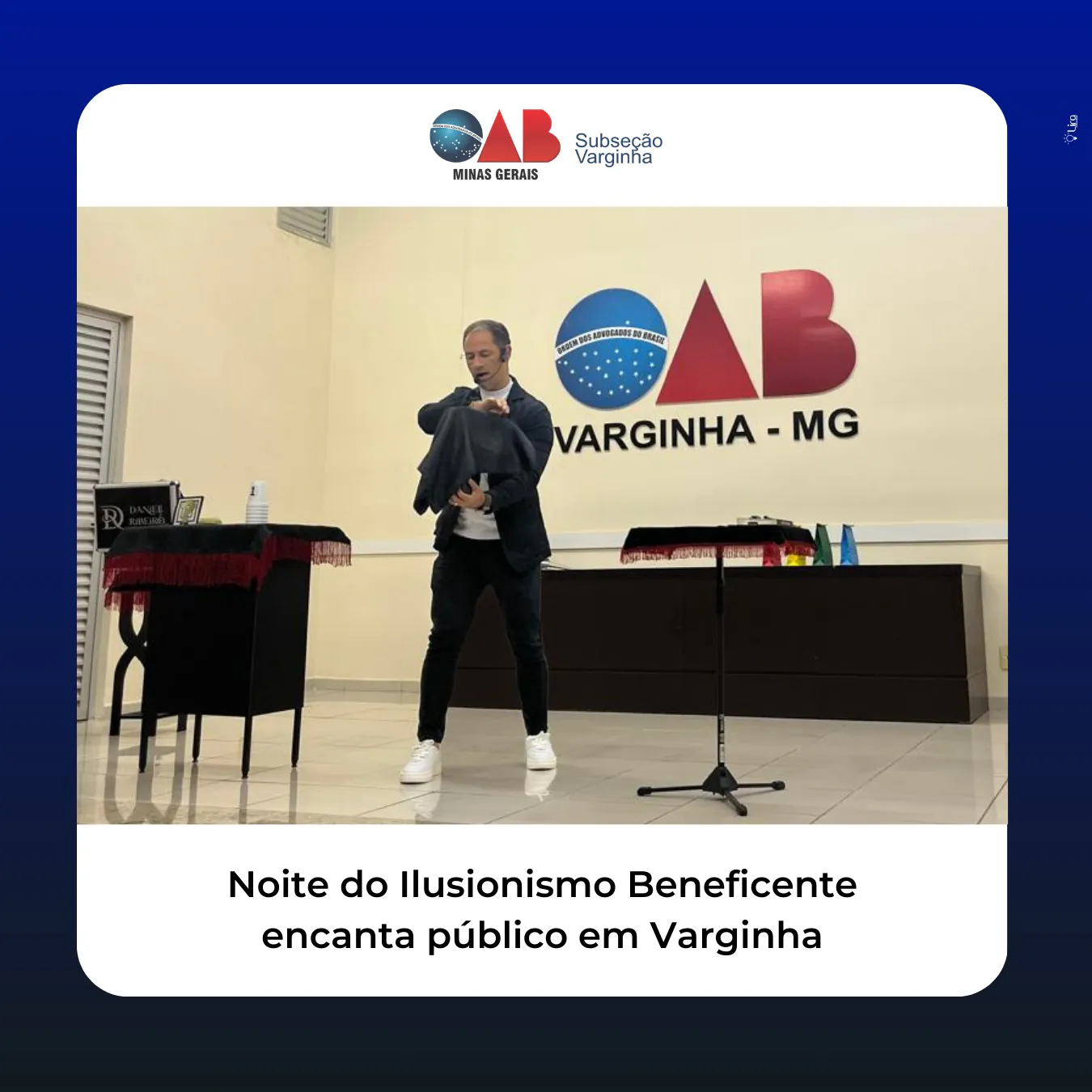 Na última noite, dia 18, a Subseção da OAB Varginha foi cenário de um emocionante show de ilusionismo beneficente. O renomado Mágico Daniel Ribeiro, conhecido por suas impressionantes habilidades, encantou a plateia com uma apresentação repleta de magia e emoção.