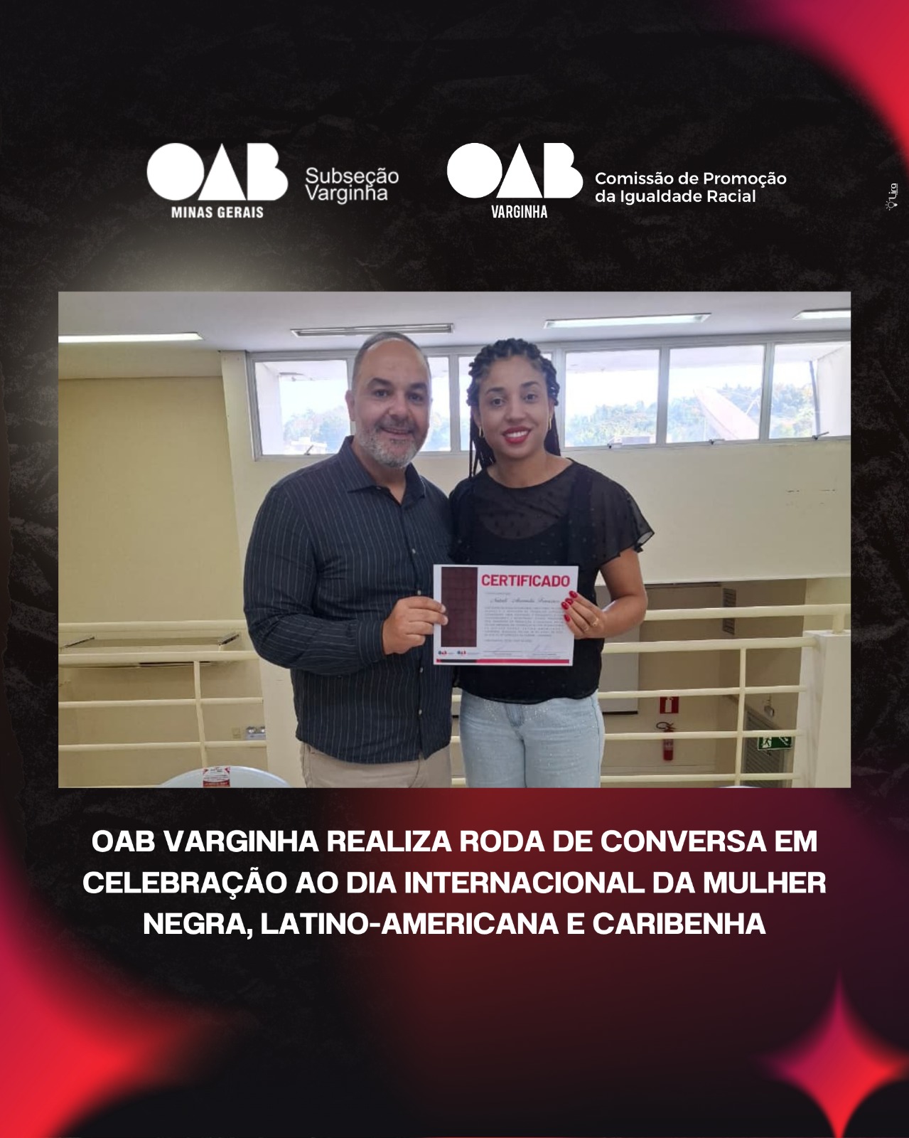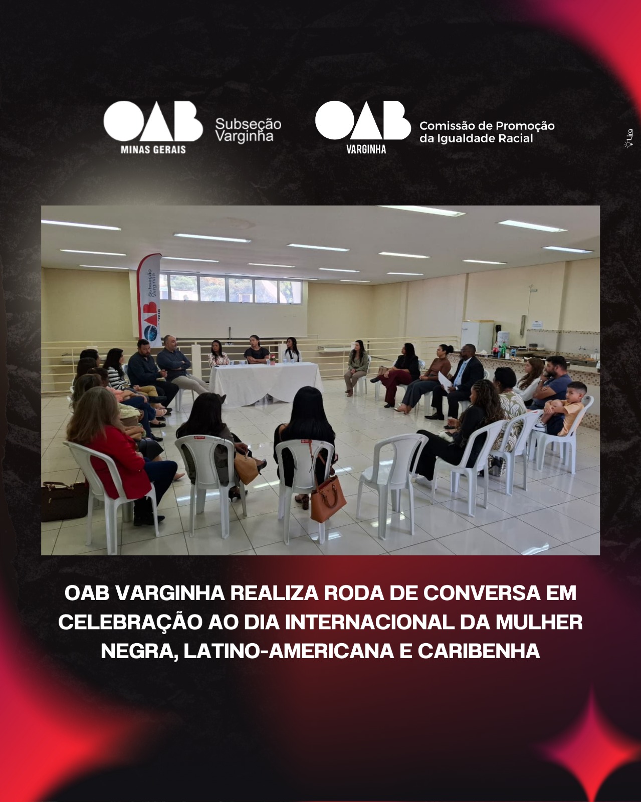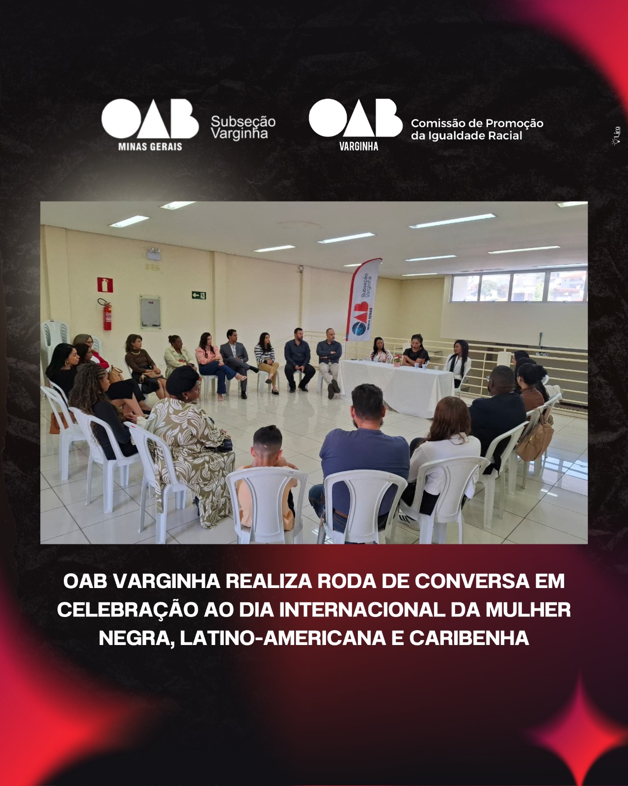 Na data de hoje (25/07), a OAB Varginha, por meio da Comissão de Promoção e Igualdade Racial, promoveu um importante evento em celebração ao Dia Internacional da Mulher Negra, Latino-Americana e Caribenha. A atividade aconteceu nas dependências do auditório da OAB Varginha e reuniu advogados, estudantes e membros da comunidade em uma enriquecedora roda de conversa.
