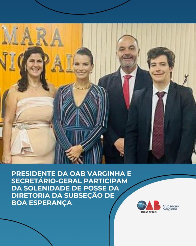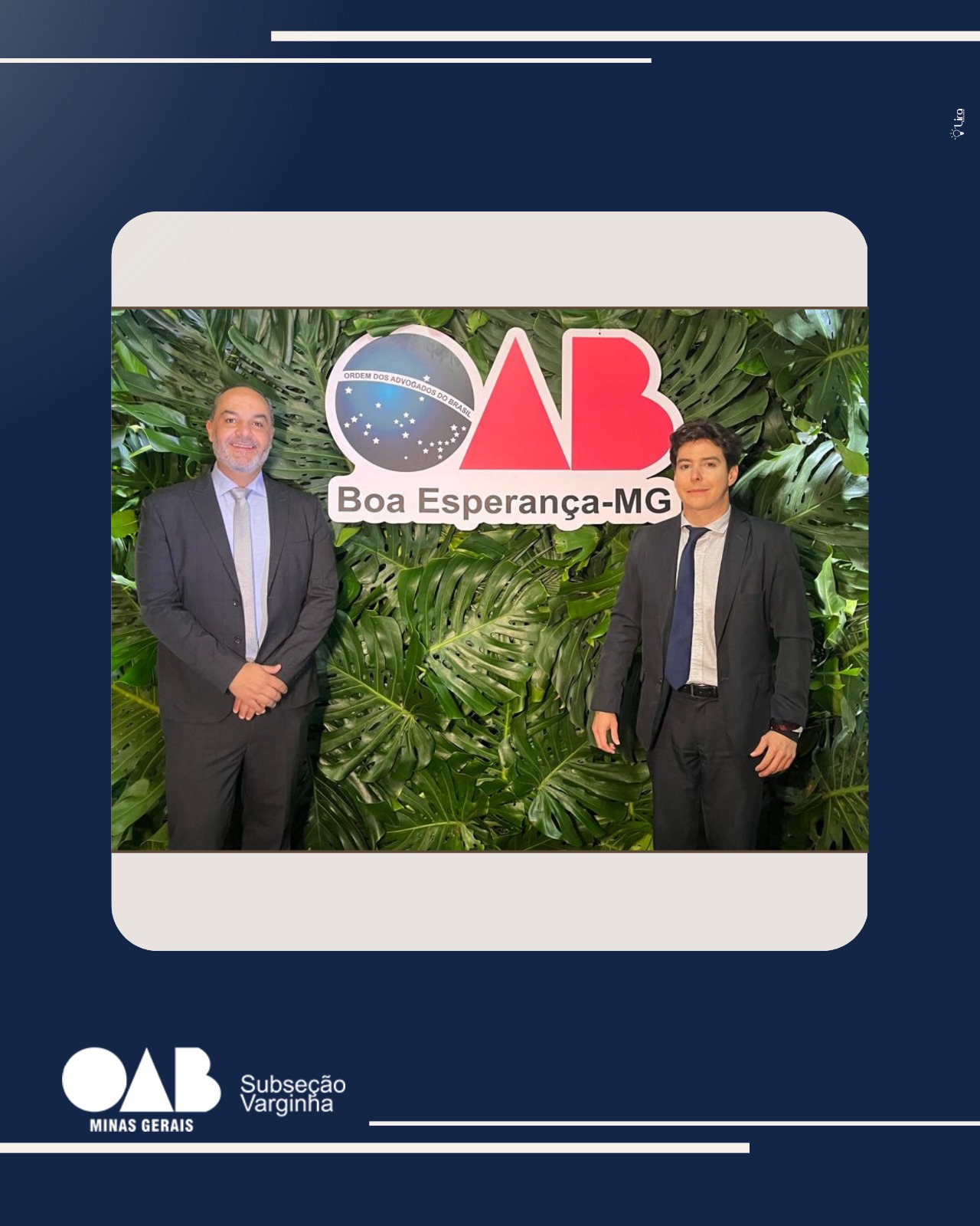 A Subseção de Varginha agradece o convite e parabeniza a presidente da OAB Boa Esperança, Dra. Gisa de Lara Ferreira Carvalho e toda Diretoria da subseção, pela brilhante organização e pelo excelente evento, que celebrou com grande estilo a advocacia da região.