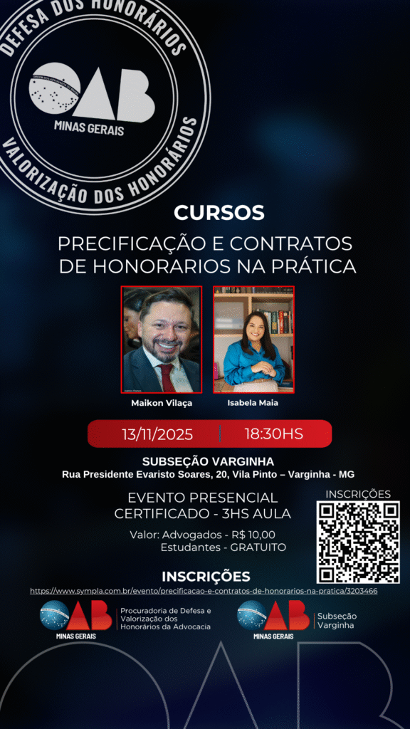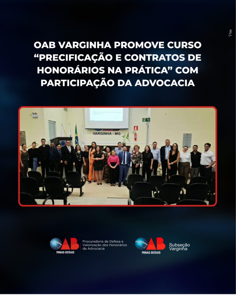 A OAB Varginha realizou, no dia 13 de novembro de 2025, o curso “Precificação e Contratos de Honorários na Prática”, iniciativa voltada ao fortalecimento da gestão profissional da advocacia, com foco na correta precificação dos honorários e na elaboração de contratos mais seguros e efetivos.